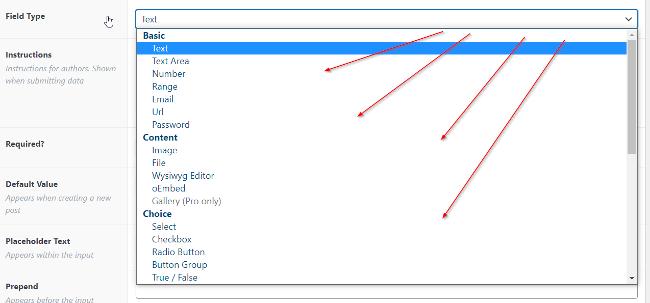 The Advanced Custom Fields plugin gives you many options for the field type. Field type basically means the type of information. For example, do you want to use letters, numbers, images, files, URLs, email addresses, number ranges, select, checkbox, radio buttons, etc. It is important to think about this as it will affect the final outcome of your Divi website. The most common are text, number, link, image, range, select, checkbox and file. Click HERE to see more information on each field. Please note that we currently do NOT support the following fields: