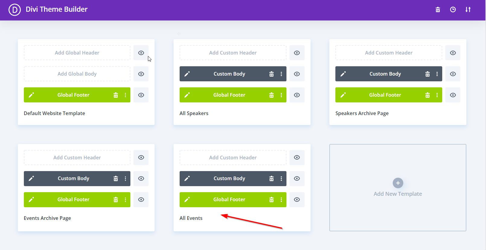 Single post pages are the products of your dynamic Divi website. For example, in the image below Events are my products and therefore will be single post pages. Note that Events are a custom post type that I have created in Divi Machine. Each post inside of the Events post type will be assigned the template made in the Divi Theme Builder and will have the URL diviengine.com/events/event-name. To build your own single post page template create a new Theme Builder Template and assign it to the All of your Custom Post Type.