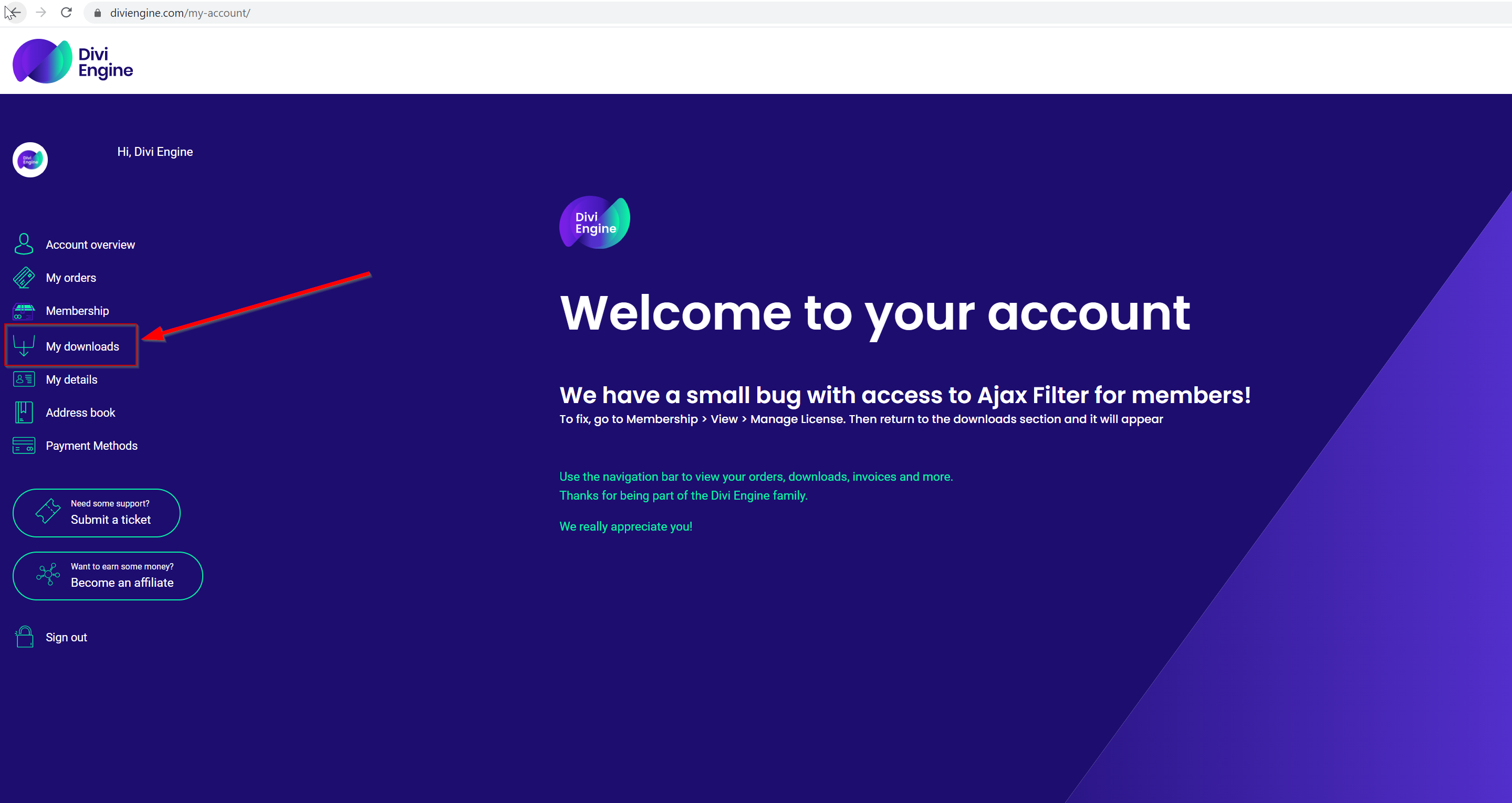 Account & License ManagementHow Do I Access My Downloads?On this pageHow Do I Access My Downloads?Introduction Follow this step to learn how to access your orders. Step 1: Go To Your Divi Engine Account After you have completed a purchase, go to the downloads section of your Divi Engine account or click HERE.