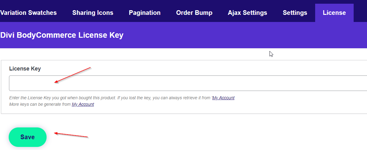Copy and paste your license key into the license area of your plugin and click the Save button.