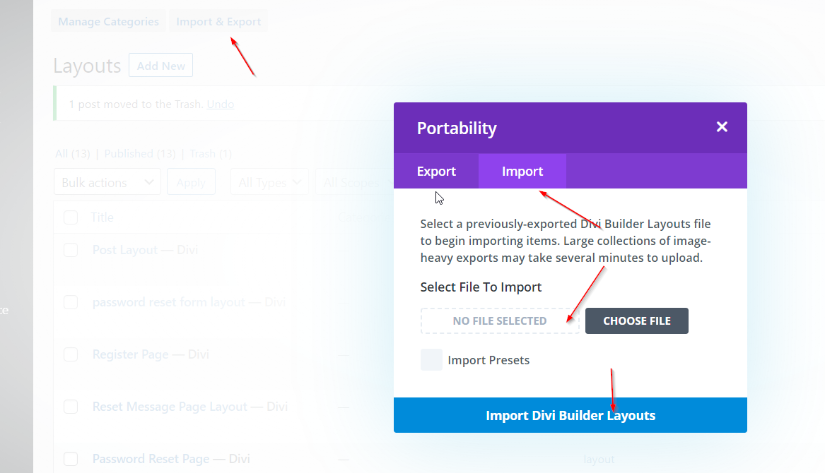 In the Divi library of your new website, go to Import & Export > Import and then select your Exported section or sections saved as .JSON file. Now you can add it to any page.
