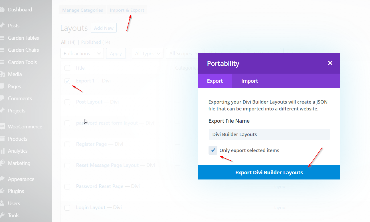 In the Divi Library click on the section or sections that you want to export and then export from the Import & Export button.