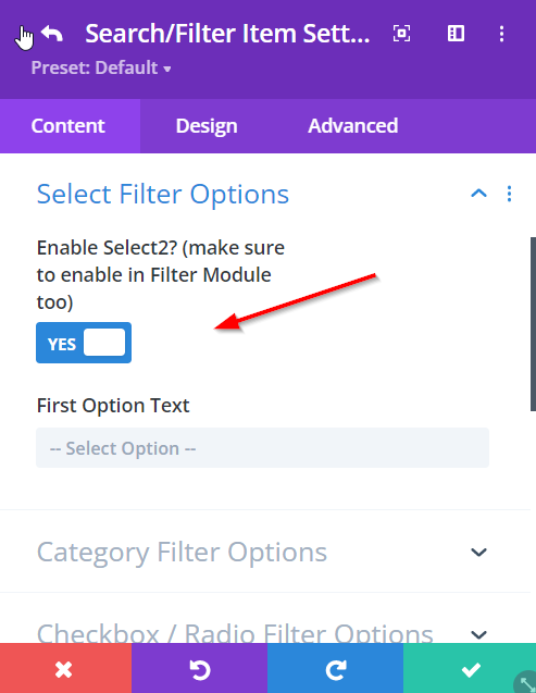 To add this feature to your filter, enable the Select2 button on the main settings section of the Filter Posts module.
